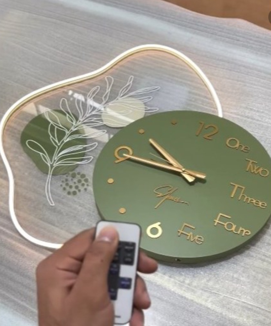 ساعت دیواری زیبای گرین سبک مدرن در چهار رنگ سفید، سبز، طوسی و مشکی. قطر گردی ساعت در سه حالت: بدون نور، نوری با سیم، نوری بدون سیم و ریموت دار. ترکیب چوب ام دی اف و صفحه شفاف کریستال پلکسی دارای لاین نوری درخشان کار شده که با ریموت و بدون ریموت کار می کند. موتور تایوانی اصل با ضمانت و بسته بندی صادراتی با پک کامل.