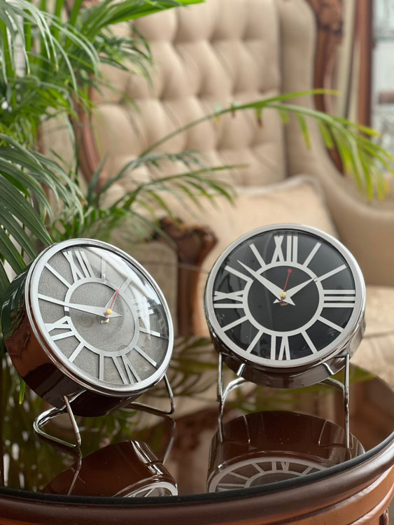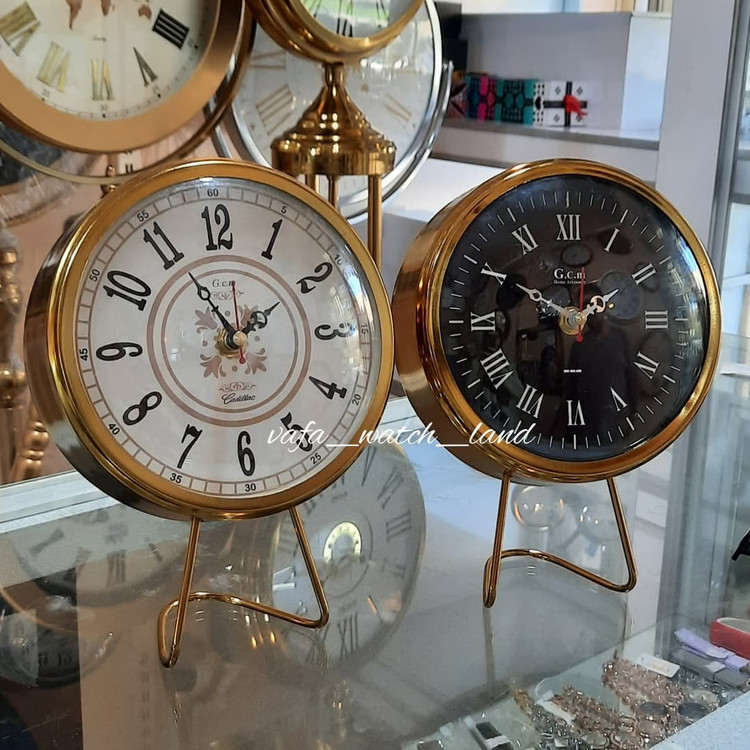 ساعت رومیزی تمام فلز با آبکاری فورتیک رنگ ثابت و با صفحه سفید و مشکی. قطر صفحه با دو مدل عدد و دو رنگ مختلف. موتور آرامگرد و بدون صدا با یکسال ضمانت.